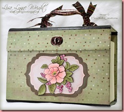 Step 4: Next, I covered the sections with paper. I used the small dots paper on all the panels, except the bottom, on which I used solid dark green. I used the oval punch to get the opening around the clasp. The handle was tougher – I ended up punching ovals in black paper rectangles to cover the seams in the patterned paper.